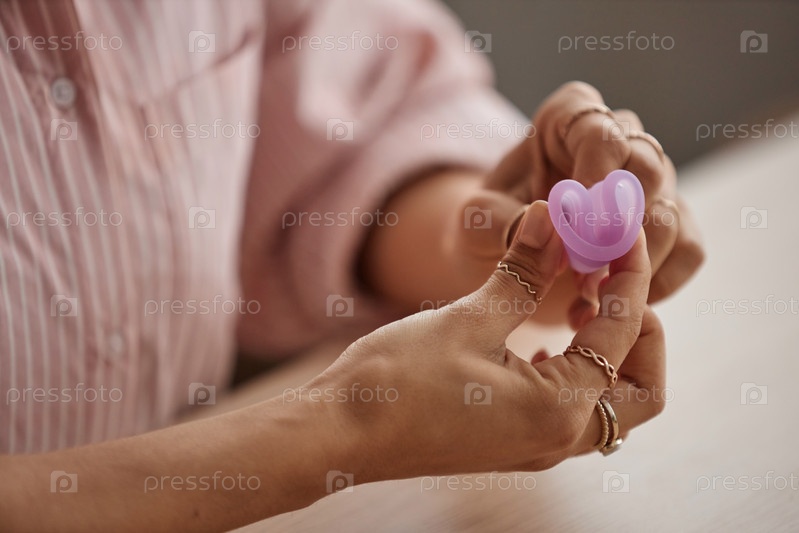 Ближайшее изображение женщины, складывающей менструальную чашку на камеру