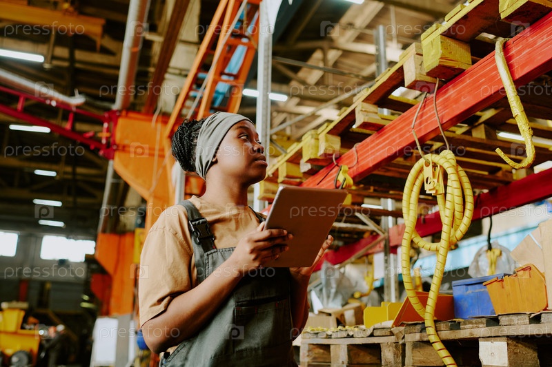 Чернокожая женщина использует цифровой планшет на работе в фабрике