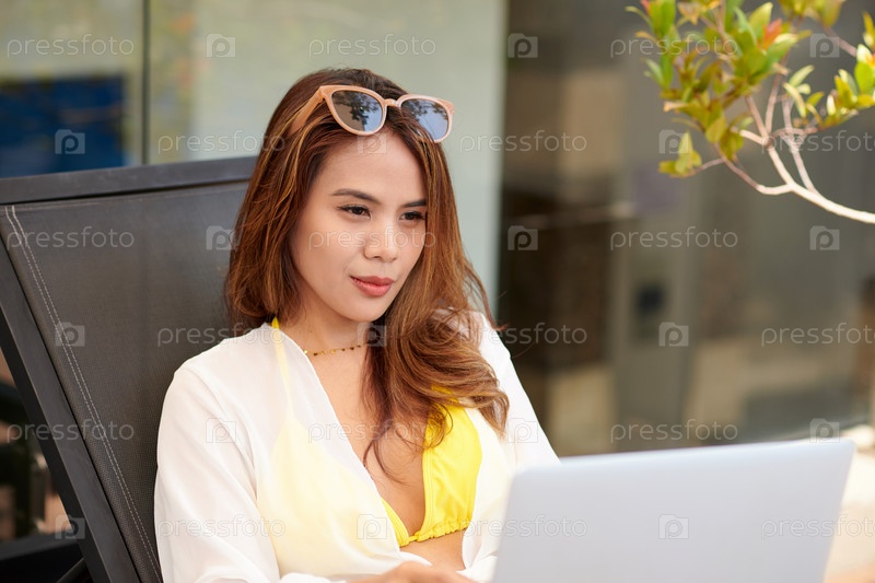 Женщина в бикини работает на ноутбуке