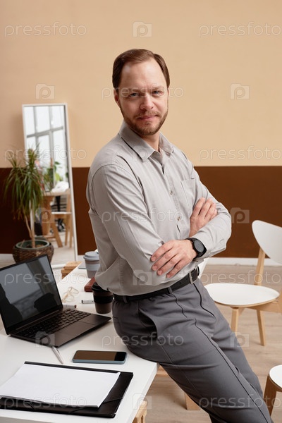 Успешный бизнесмен, опирающийся на стол в офисе