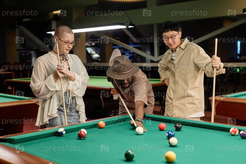 Разнообразная группа людей, играющих в бильярд вместе
