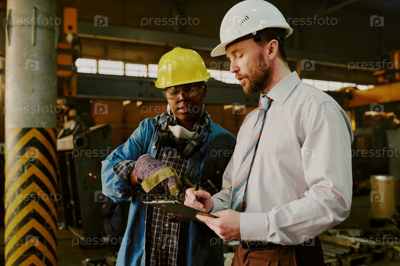 Два фабричных рабочего делают инвентаризацию