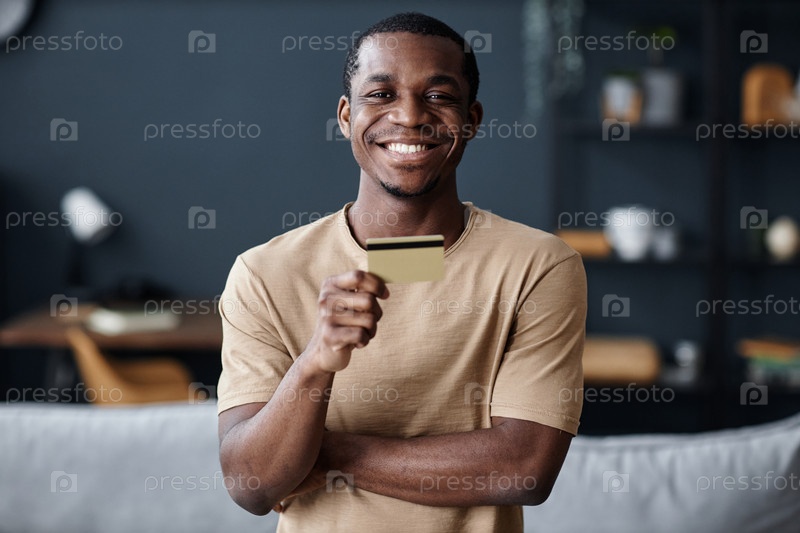 Веселый черный парень, держащий кредитную карту