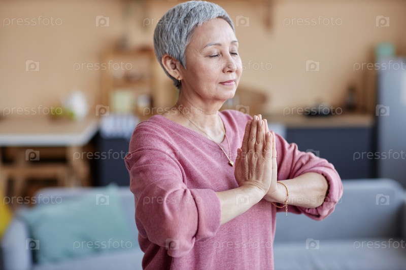 Пожилая женщина, медитирующая дома