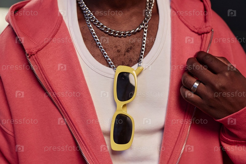 Детальный снимок чернокожего мужчины, носящего модные аксессуары