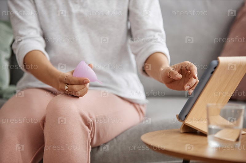 Девушка, которая держит менструальную чашку и смотрит инструкции