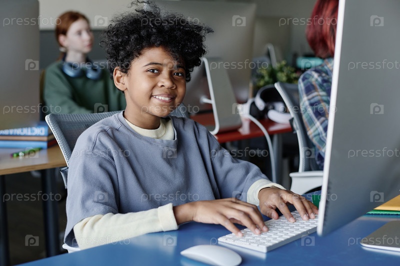 Афроамериканский ребенок печатает на компьютере в классе
