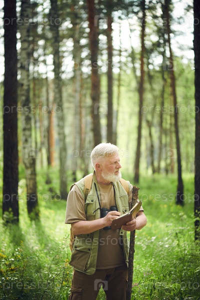 Пожилой ученый делает заметки в лесу