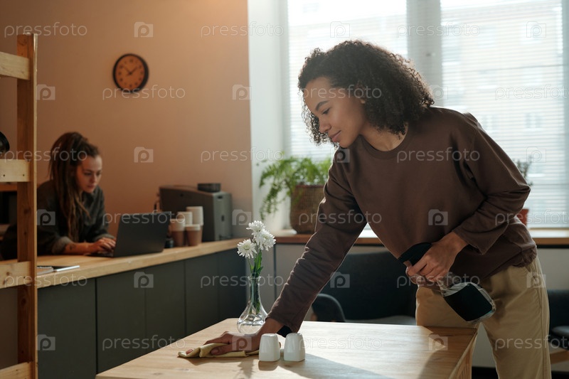 Владелец кафе вытирает стол пылесосом