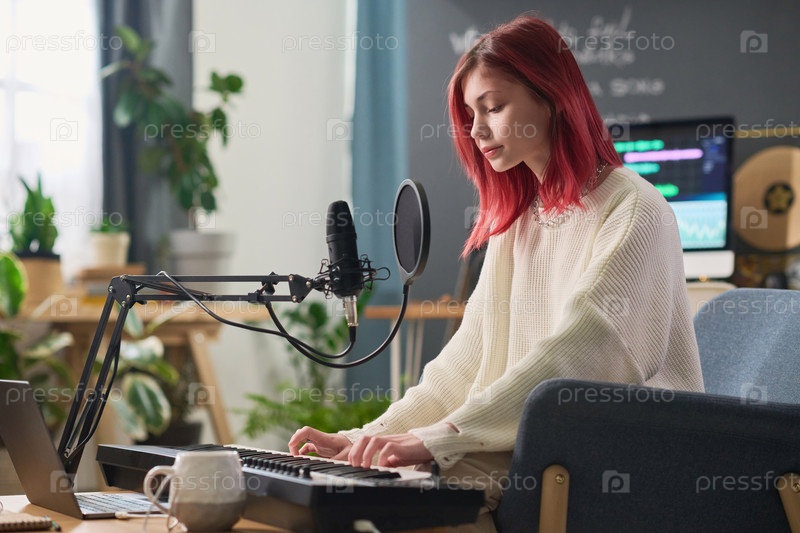 Играет на синтезаторе перед ноутбуком