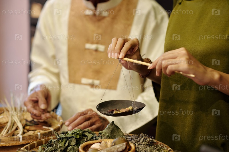 Измерение ингредиентов в традиционной азиатской аптеке женщина