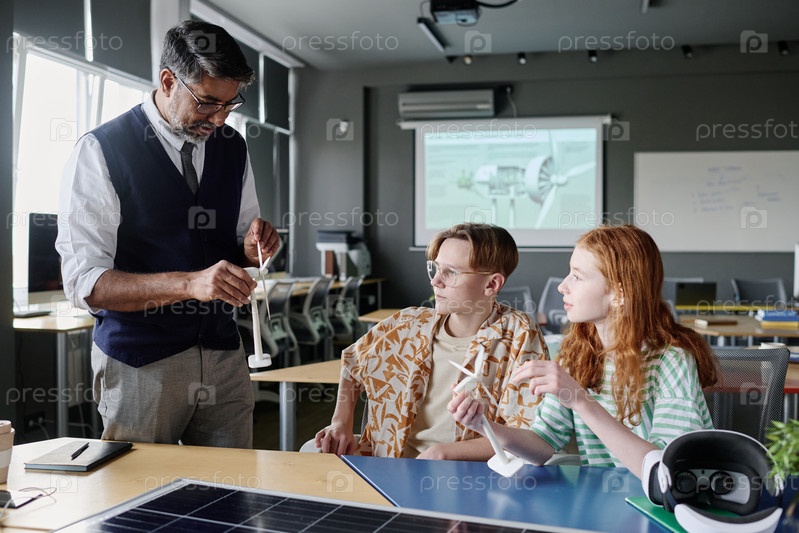 Учитель показывает студентам модель ветряной турбины