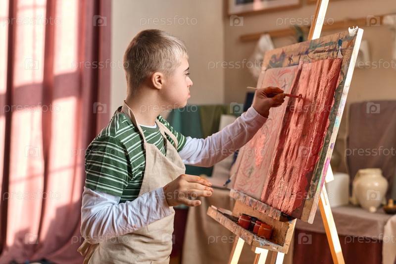 Мальчик с синдромом Дауна рисует на лодке в художественной студии