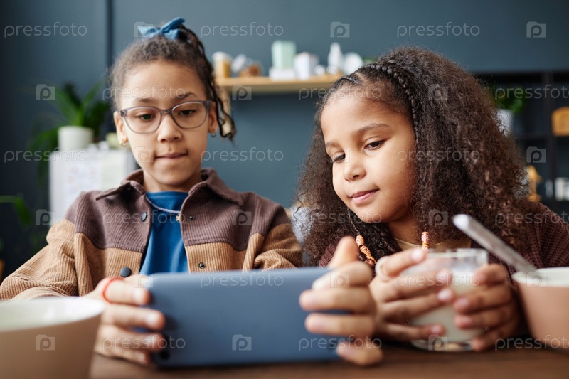 Две чернокожие девушки пользуются телефоном на завтраке