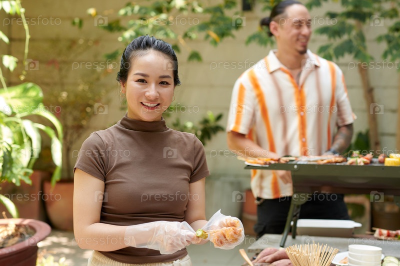Женщина, делающая кебаб для друзей