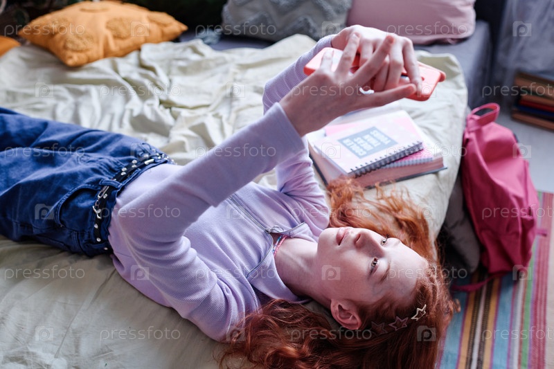 Девушка делает селфи, отдыхая в постели