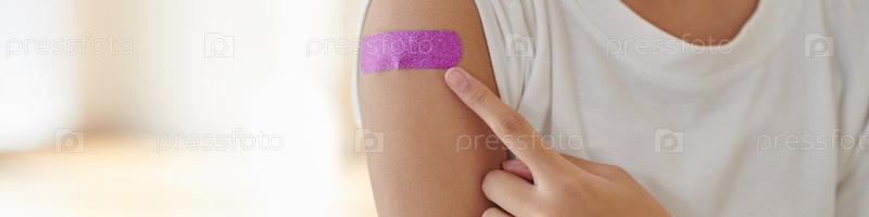 Девушка, указывающая на розовую повязку на руке