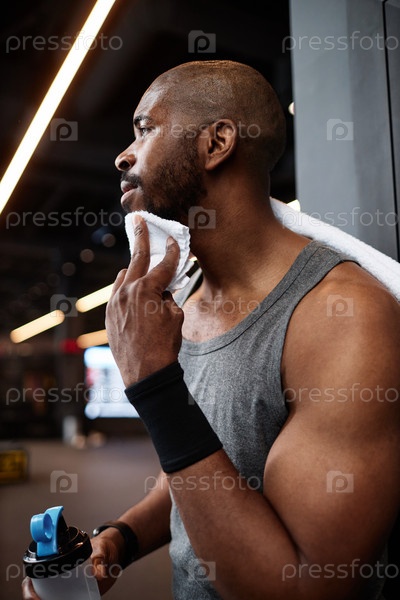 Мускульный чернокожий мужчина стирает пот в тренажерном зале