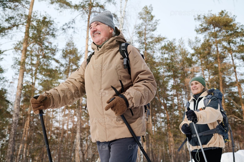 Веселые пожилые люди ходят в походы с трекинговыми поляками
