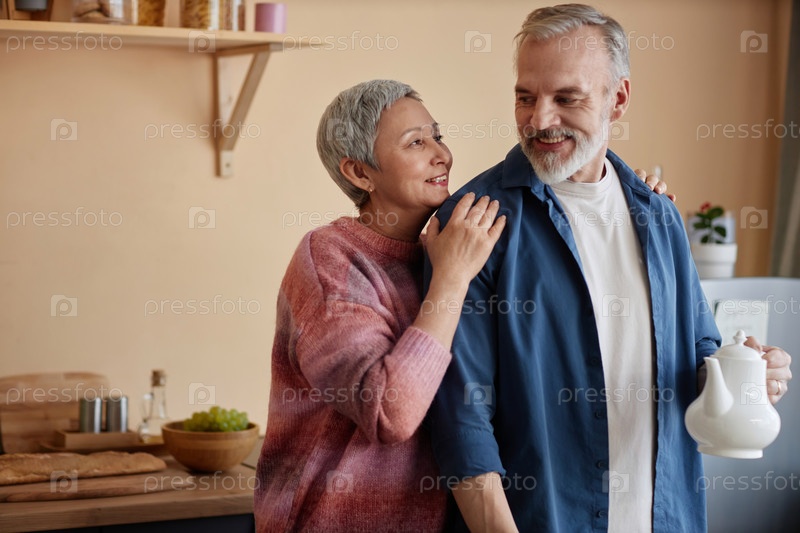 Улыбающаяся старшая пара обнимается дома