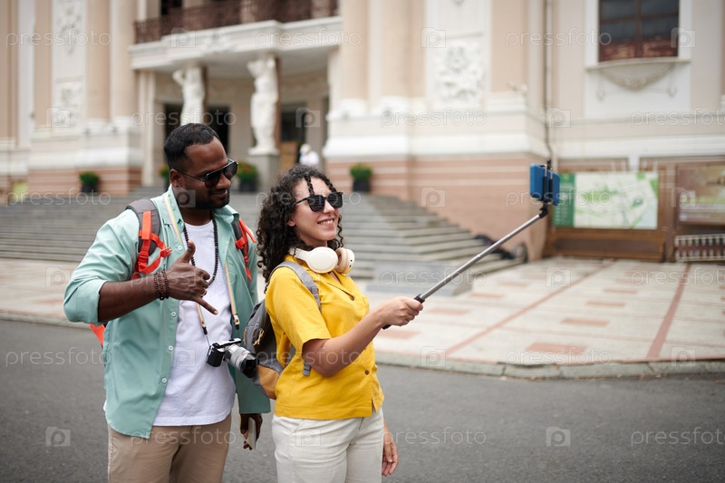 Счастливые молодые туристы, делающие селфи