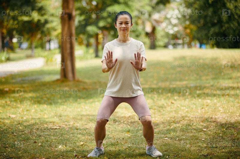 Женщина, занимающаяся тай-чи конную позу