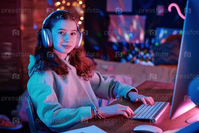 Подростковая девушка в наушниках сидит за столом в своей современной комнате