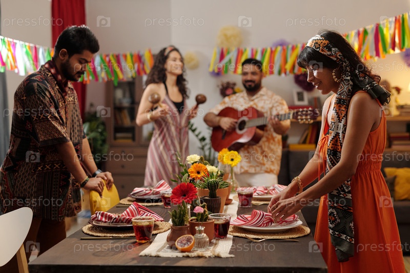 Молодая пара стоит за праздничным столом