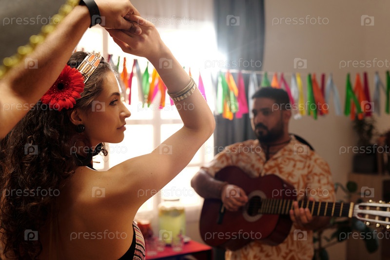 Молодая красивая танцовщица наслаждается домашней вечеринкой