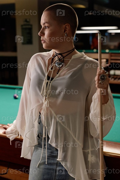 Уверенная в себе молодая женщина в бильярдном клубе