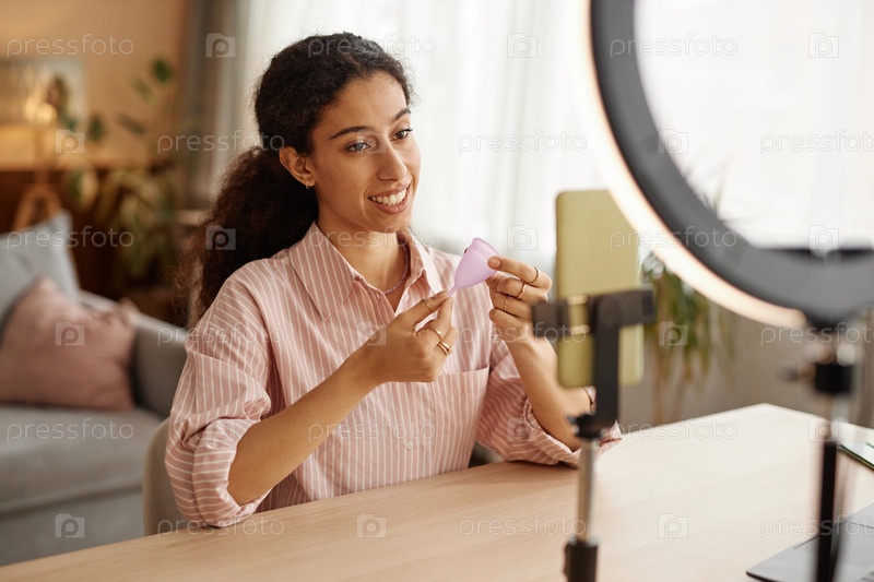 Девушка держит менструальную чашку, записывая видео о женском здоровье