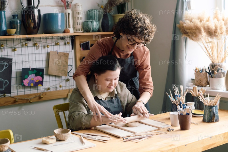Ремесленник и девочка с инвалидностью, выкачивающая глину