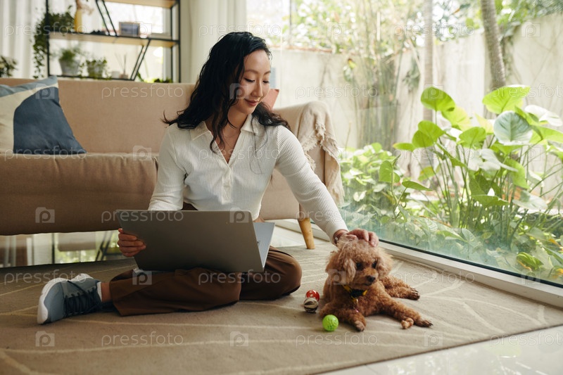 Молодая женщина ласкает собаку