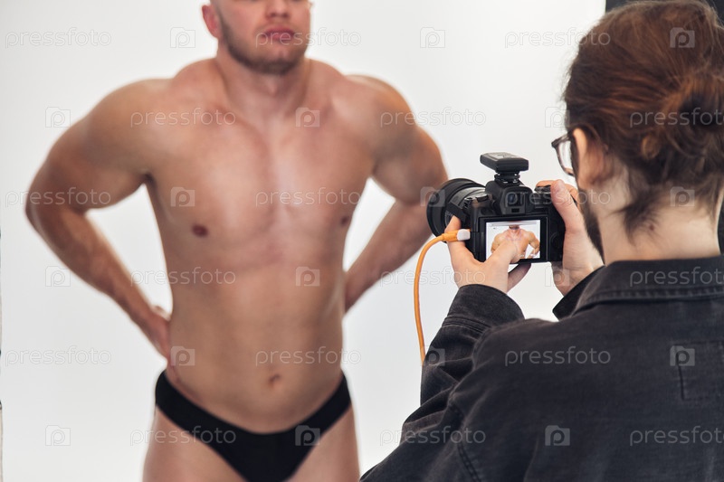 Снимок над плечом мужской модели в фотостудии