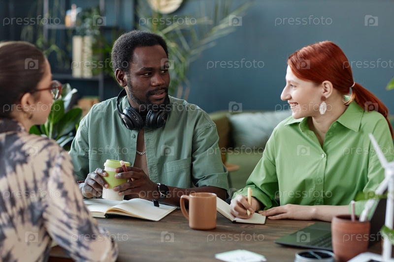 Чернокожий мужчина разговаривает с коллегами за столом заседаний