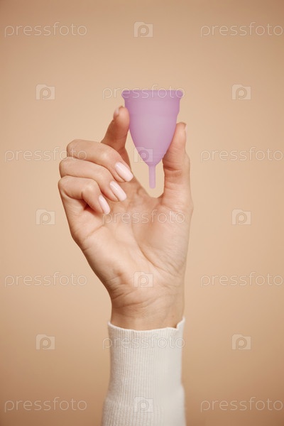 Рука, держащая менструальную чашку на бежевом