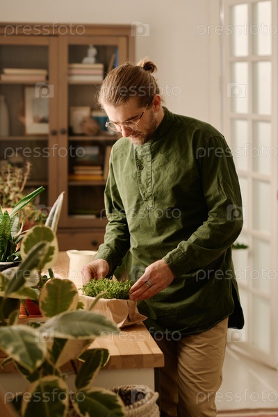 Мужчина, заботящийся о маленьких зеленых саженцах