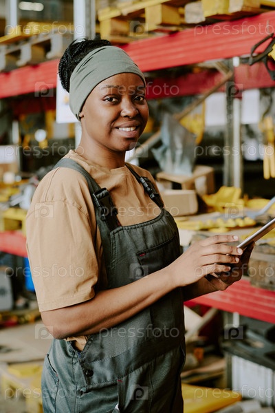 Женщина-фабричный рабочий с цифровым планшетом