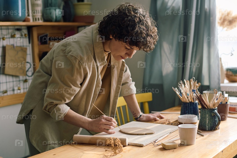 Женщина-ремесленница, режущая глину