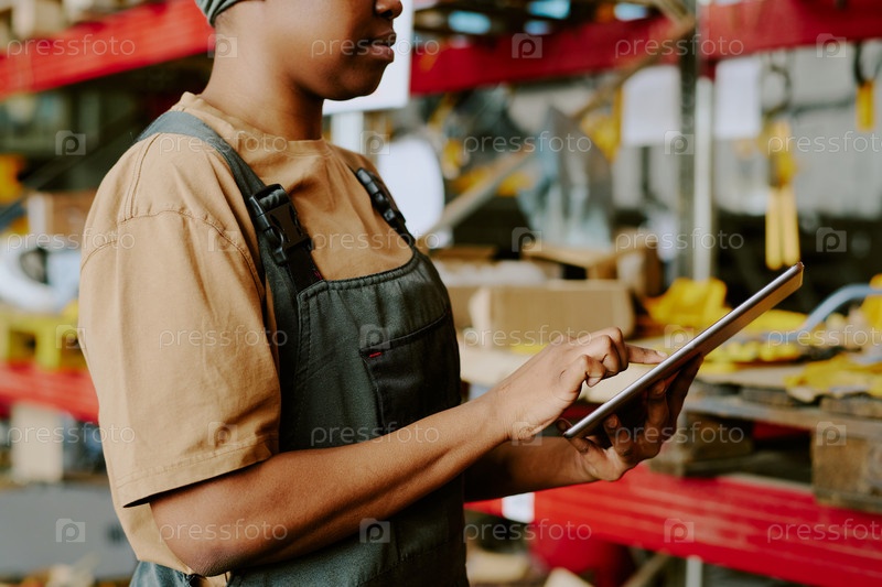 Чернокожая женщина использует цифровой планшет на работе в складе