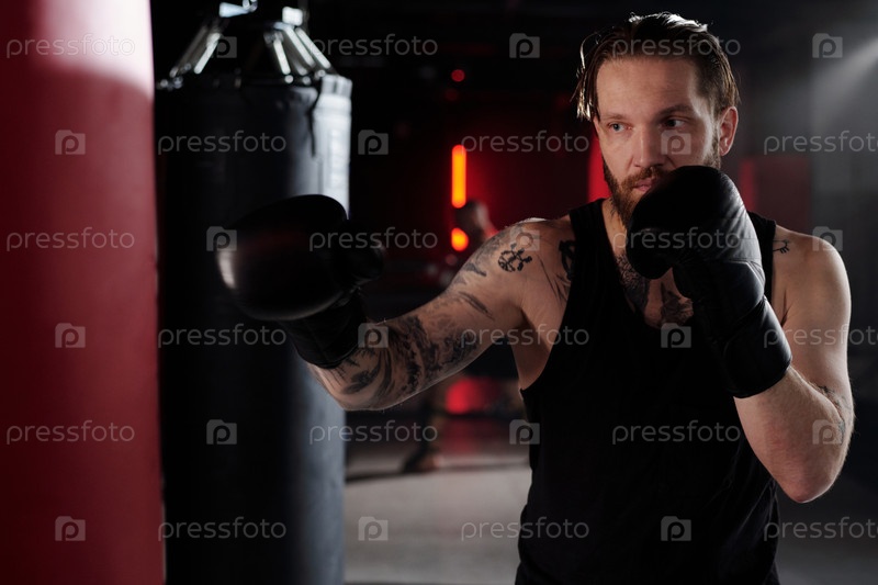 Боксёр смотрит на боксерский пакет Мужчина