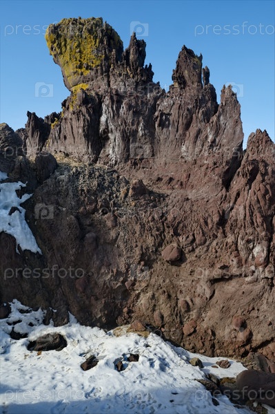 Россия. Дальний Восток, Курильские острова. Очень твердые и острые базальтовые скалы вдоль побережья Охотского моря на острове Итуруп