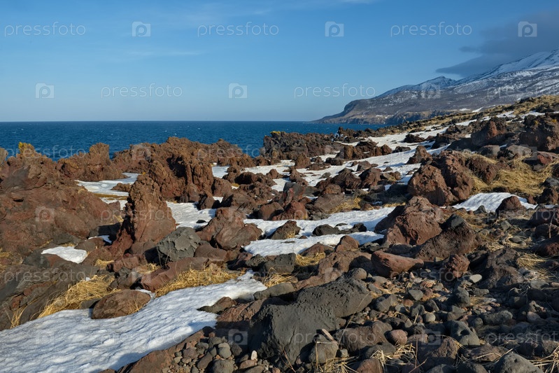 Россия. Дальний Восток, Курильские острова. Очень твердые и острые базальтовые скалы вдоль побережья Охотского моря на острове Итуруп