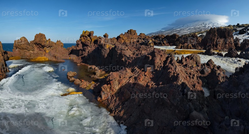 Россия. Дальний Восток, Курильские острова. Очень твердые и острые базальтовые скалы вдоль побережья Охотского моря на острове Итуруп