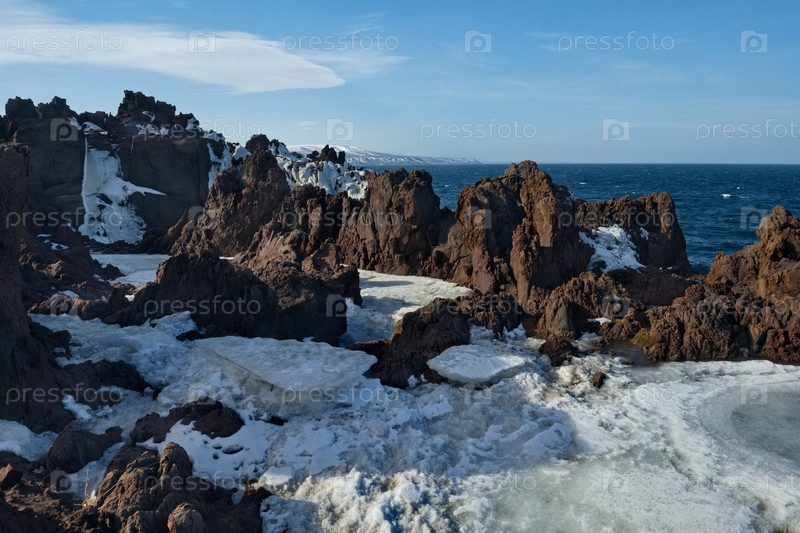 Россия. Дальний Восток, Курильские острова. Очень твердые и острые базальтовые скалы вдоль побережья Охотского моря на острове Итуруп