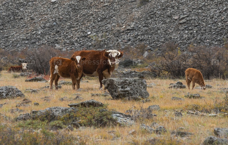 Россия. Горный Алтай. Небольшое стадо коров мирно пасется в долине реки Чулышман