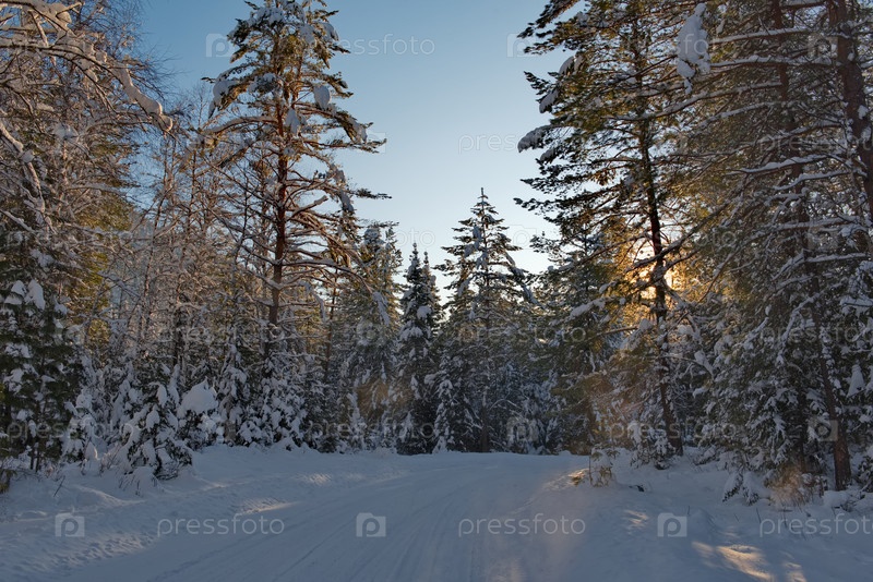Россия. Юг Западной Сибири, горный Алтай. Вид на заснеженные таежные деревья освещенные закатным солнцем недалеко от села Кебезень по дороге на Телецкое озеро