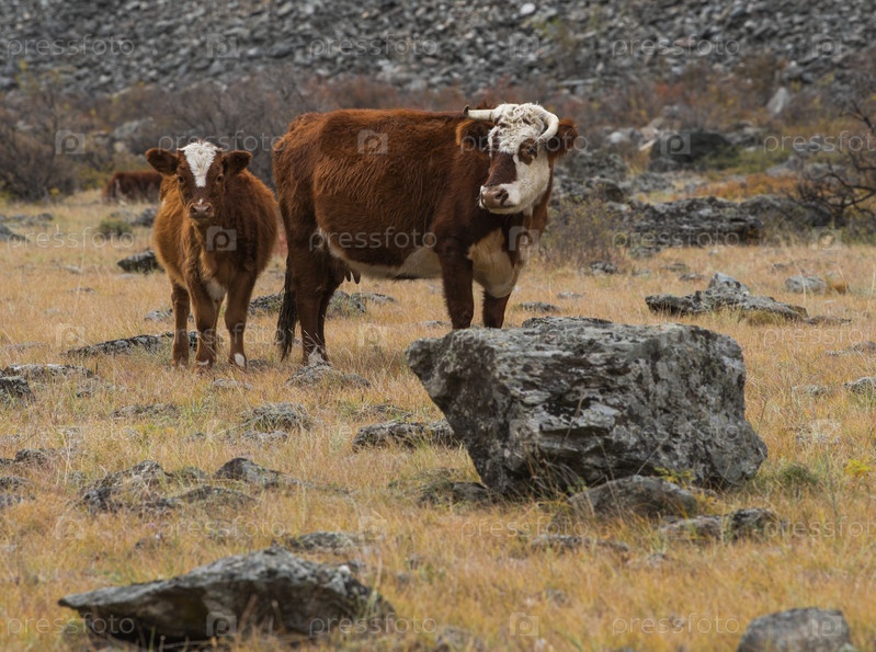 Россия. Горный Алтай. Небольшое стадо коров мирно пасется в долине реки Чулышман