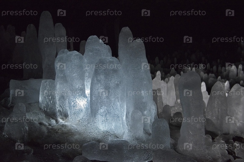 Россия. Курильские острова. Пещера с многочисленными ледяными сталагмитами на острове Итуруп. Во времена владения островами Японией до 1945 года в этих пещерах располагался военный госпиталь