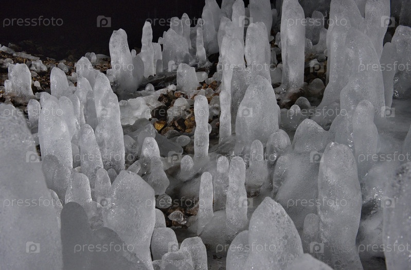 Россия. Курильские острова. Пещера с многочисленными ледяными сталагмитами на острове Итуруп. Во времена владения островами Японией до 1945 года в этих пещерах располагался военный госпиталь